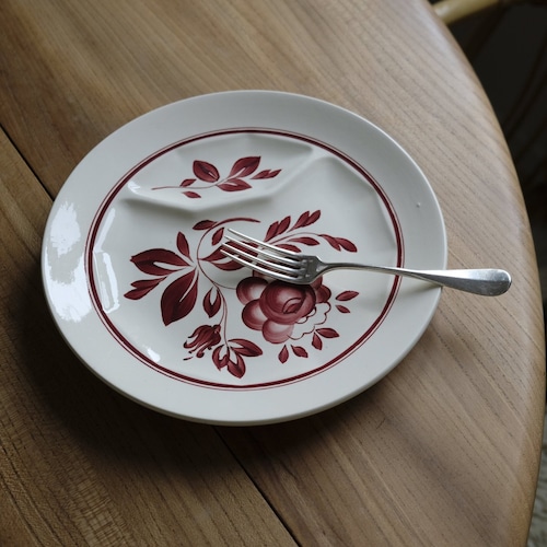 手描きのボルドー色のペイントと多角形な仕切りのあるカタチが珍しい、サルグミンヌのフォンデュプレート。フォンデュやラクレット用ですが、ソースやフルーツ、デザート、ケーキなどにちょうどよく、お使いいただきやすいサイズ感です。