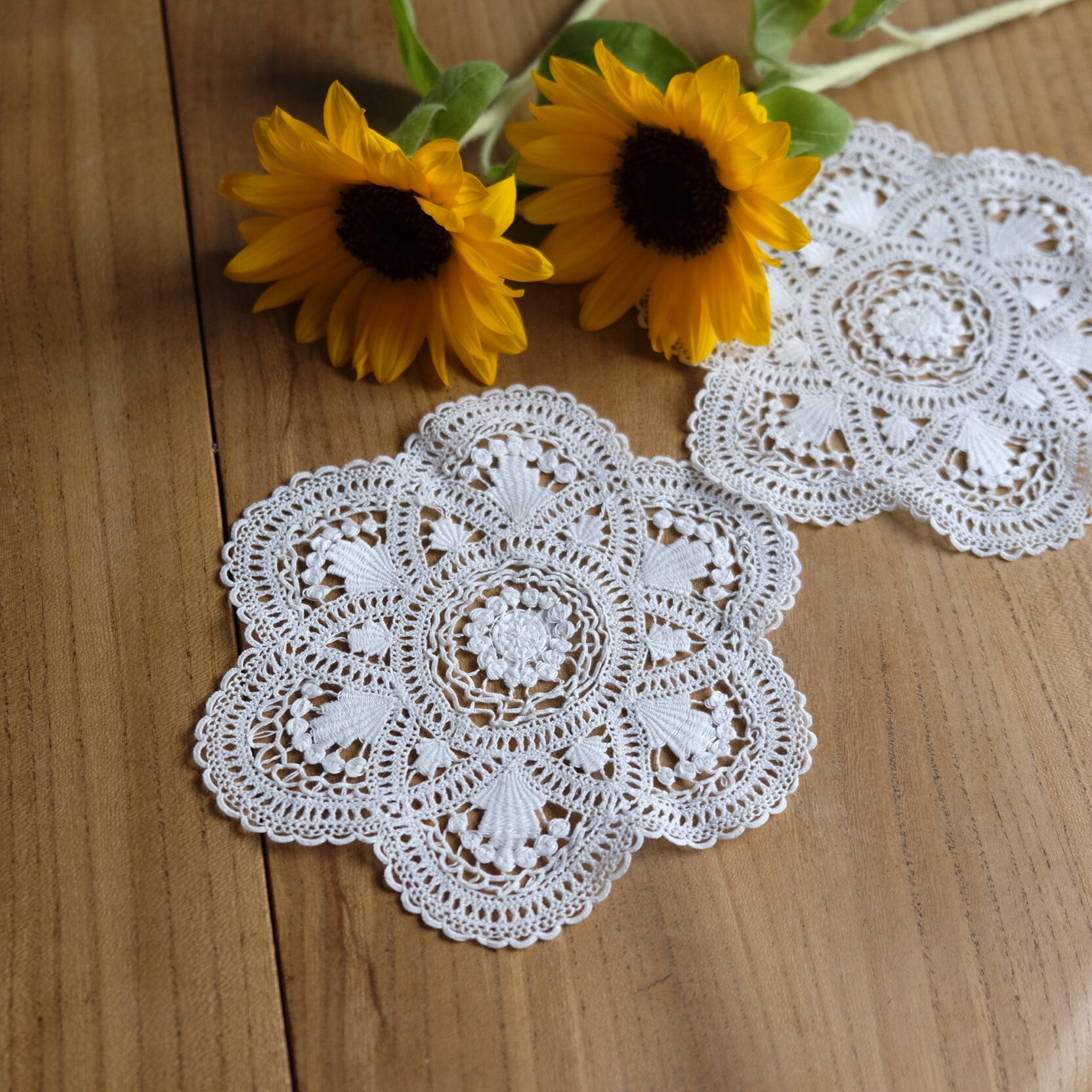 繊細なお花模様が施されたアンティークレースのクロシェドイリー。