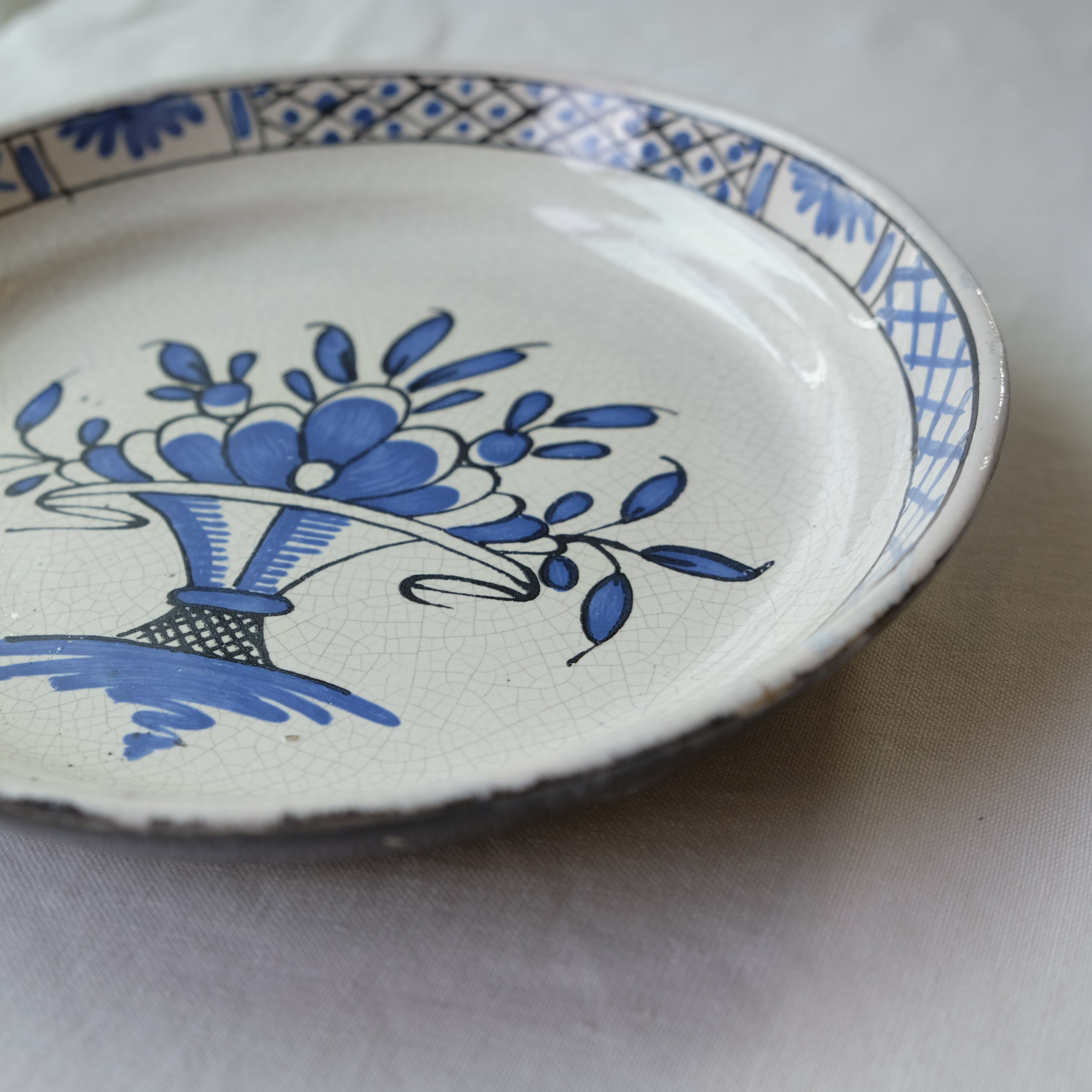 白い素地にブルーの爽やかな色合いで描かれた、花カゴの絵柄や美しい貫入、漆黒色で焼かれた背面のバランスが美しく雰囲気のあるプレートです。
